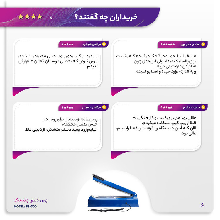 دستگاه پرس دستی پلاستیک برای بستن و اتصال دو لبه پلاستیکی از طریق جوش دادن نایلونها کاربرد دارد. این دستگاه از طریق داغ کردن پلاستیک و فشار اندکی که حین راهاندازی به آن وارد میشود، عمل اتصال و یکپارچه شدن دو لبهی نایلون را ممکن میکند. با توجه به تفاوت ضخامت نایلونها، میزان گرمای مورد نیاز برای ذوب شدن پلاستیک مختلف است. امروزه شرکتهای مختلفی در زمینهی تولید پرسهای دستی فعالیت دارند و این ابزار به وفور در بازار یافت میشوند. پرس دستی پلاستیک مدل FS-300 از محصولات پرفروش در این زمینه است و با مجهز شدن به یک تایمر زمان گرمایش میتوان از آن برای انواع نایلونها استفاده کرد. البته، رسیدن به مقادیر دلخواه دمایی نیاز به آزمون و خطا دارد. لازم به ذکر است که انرژی مورد نیاز این دستگاه از طریق برق شهری 220 و یا 110 ولت تامین میشود. این دستگاه برای انواع نایلونهای شرینک PP ،POF و PVC با ضخامت تا 0.4 میلیمتر کاربرد دارد. همچنین، طول قسمت پرس این دستگاه 30 سانتیمتر و عرض ناحیه دوخت پلاستیک آن 3 میلیمتر است.